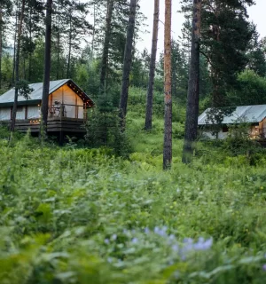 Локация глэмпинга уникальна - он расположен в сосновом бору на берегу реки Катунь в горах. Это место отличается первозданной природой, кристально чистым воздухом и неповторимой энергетикой Алтая.