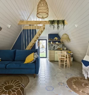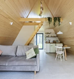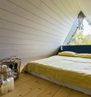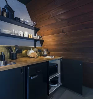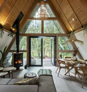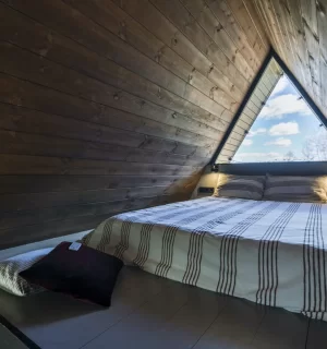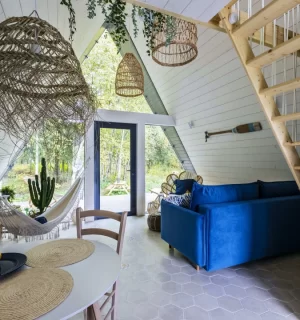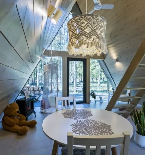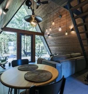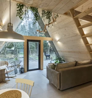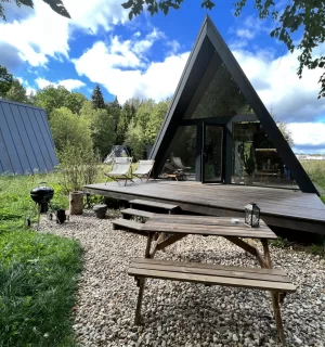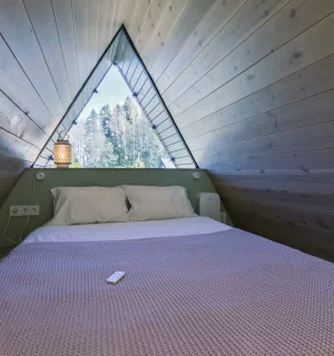 На территории расположены 4 небольших а-фрейма (minibro, scandi, hugge, tinysea) на 2-4 человека и большой а-фрейм (balidom) на 2-6 человек, каждый с уникальным дизайном. В каждом домике есть панорамные окна с видом на лес, терраса и зона для барбекю. Также в каждом домике есть мини-кухня со всем необходимым и санузел с душевой.