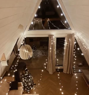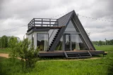 Наши двухэтажные коттеджи оснащены панорамными окнами, создающими неповторимую атмосферу. На первом этаже расположена гостиная с камином, проектором, полностью оборудованной кухней и уютной обеденной зоной. На втором этаже вас ждет комфортная спальня с потрясающим видом на окружающий лес.