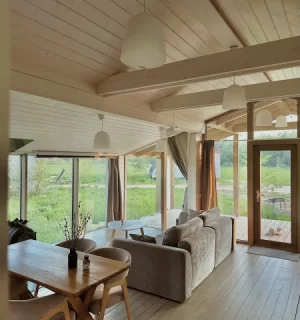 На территории Woody Village Riverside находится ресторан, а также общественное пространство, где можно расслабиться у камина, поиграть в настольные игры, поработать или посмотреть фильм.
